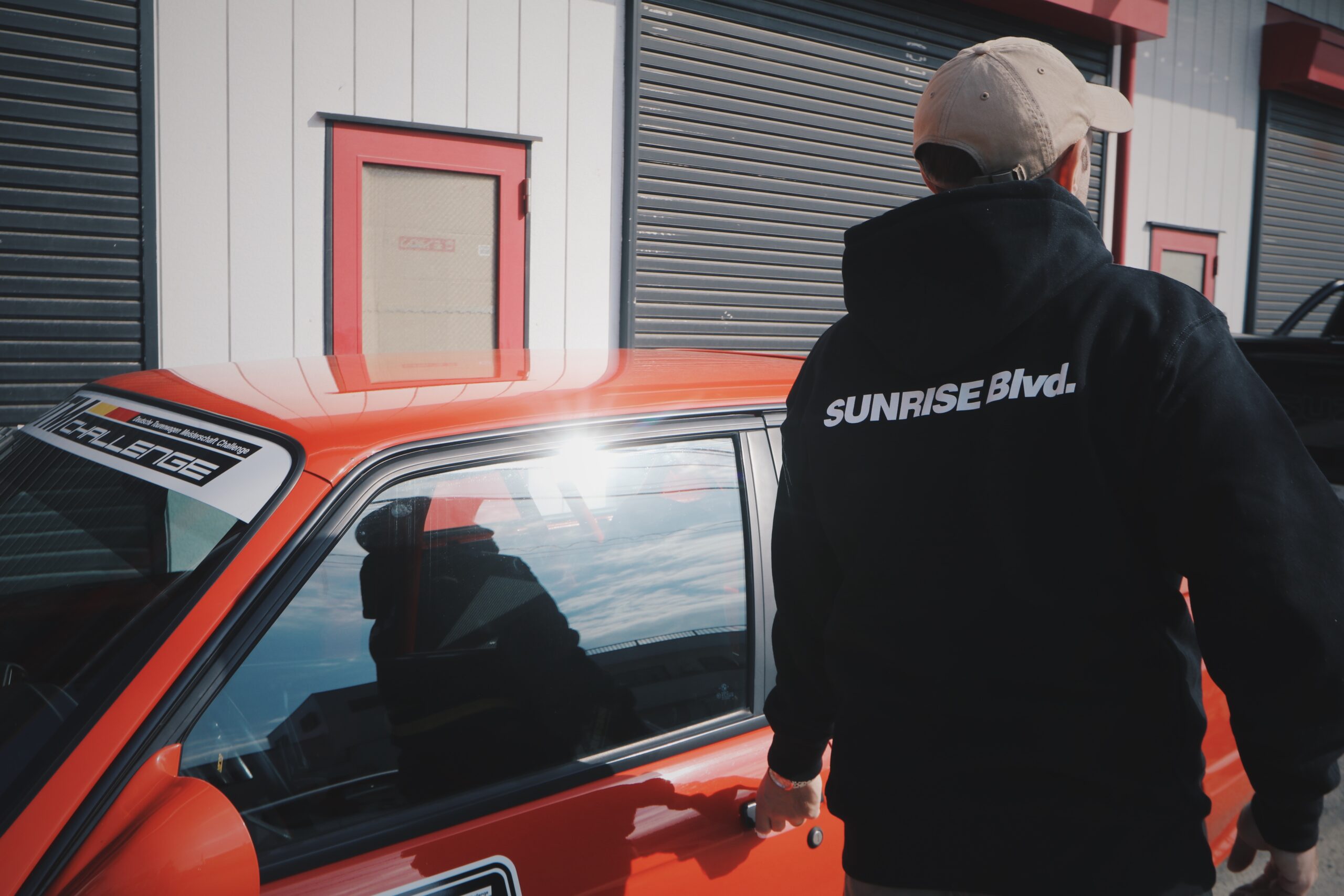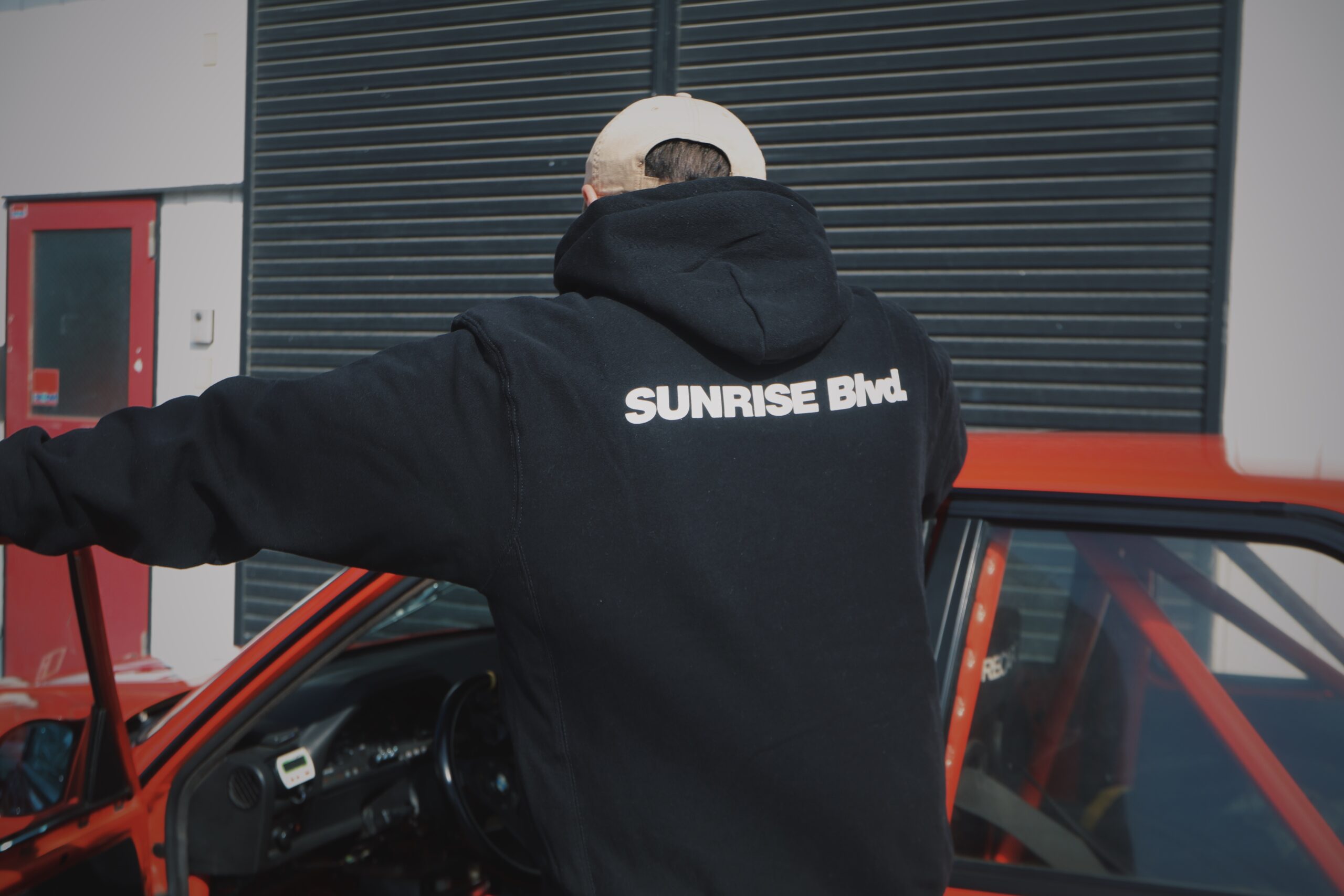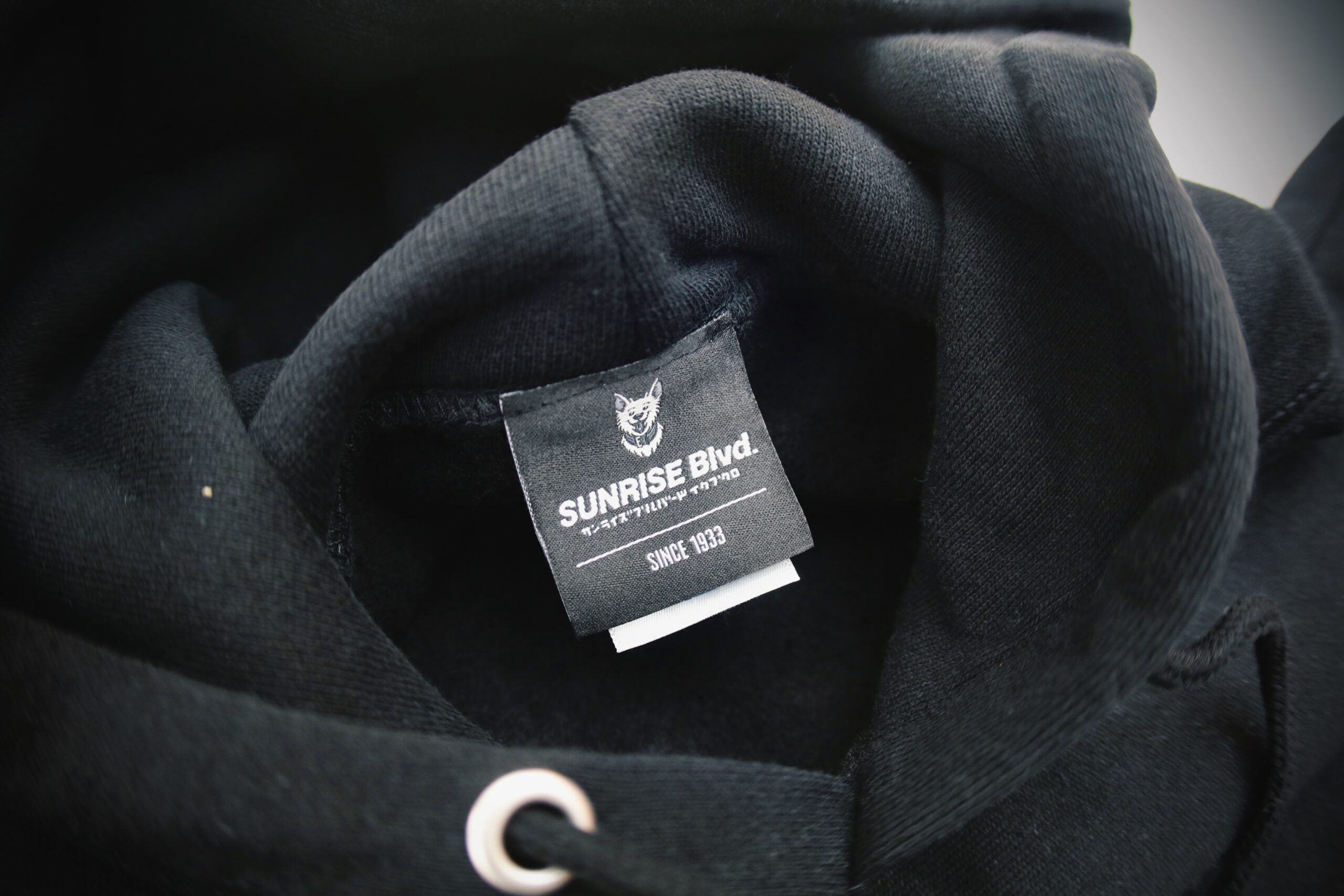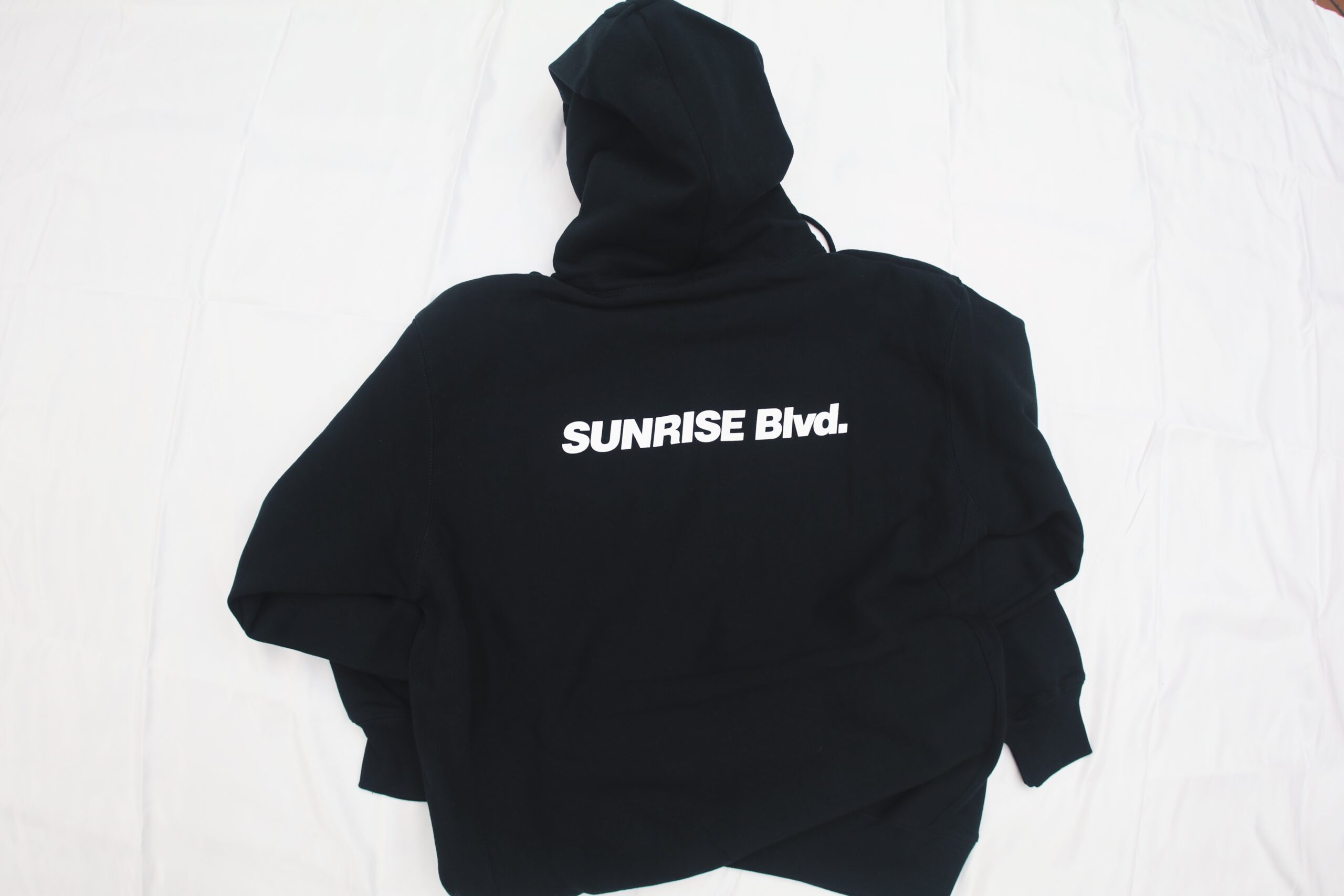 SUNRISE Blvd.オリジナルロゴをあしらい、細部までこだわり抜いたブラックフーディ。