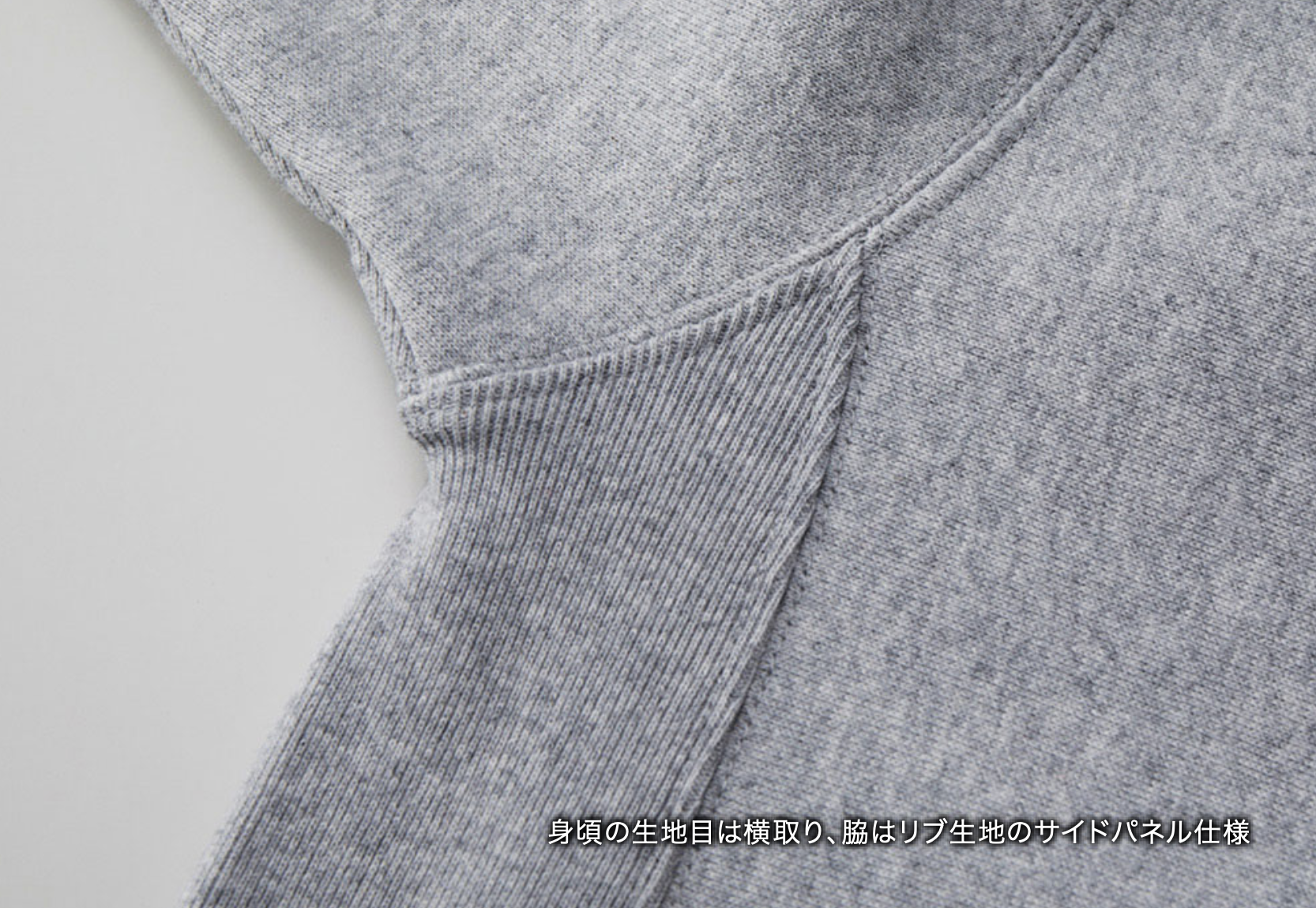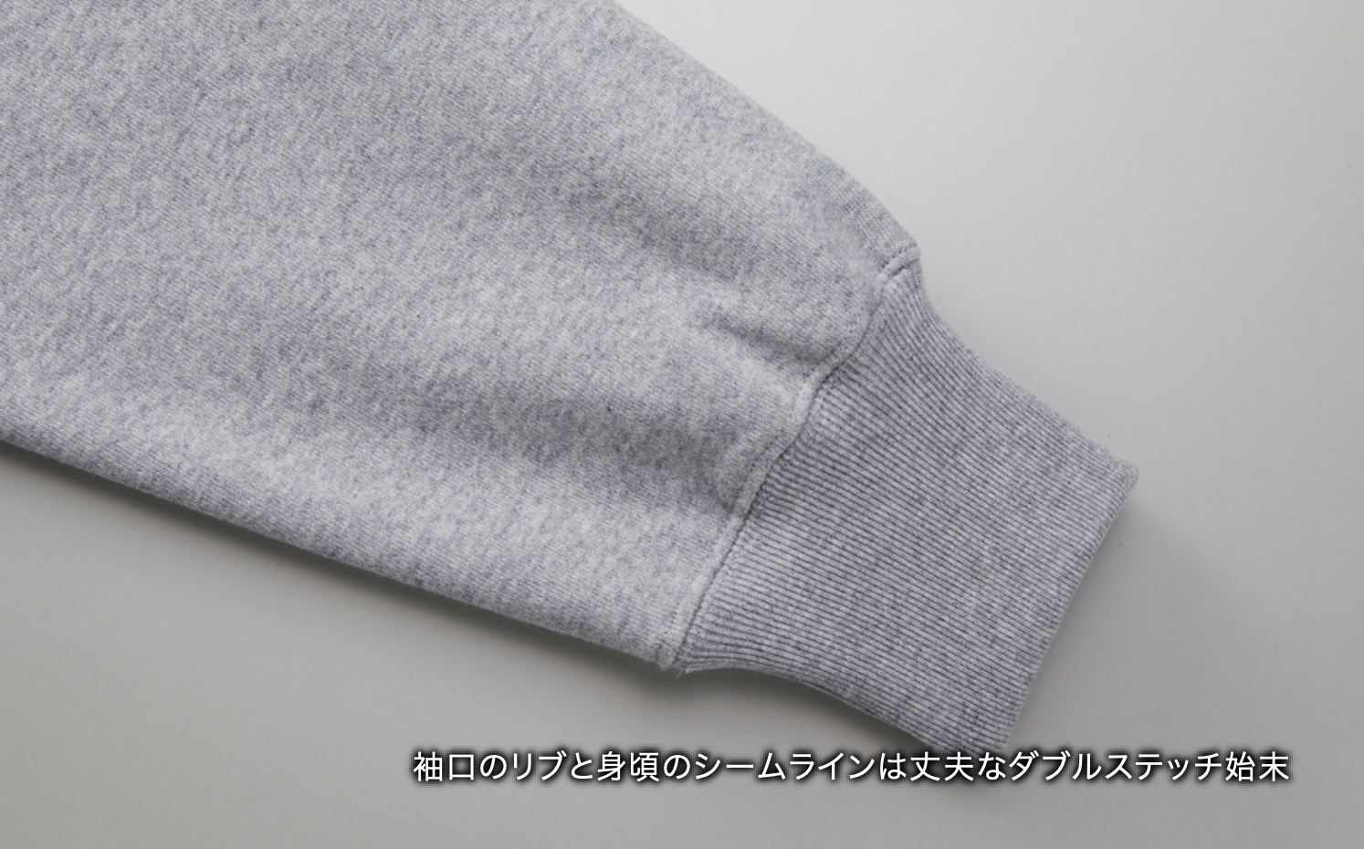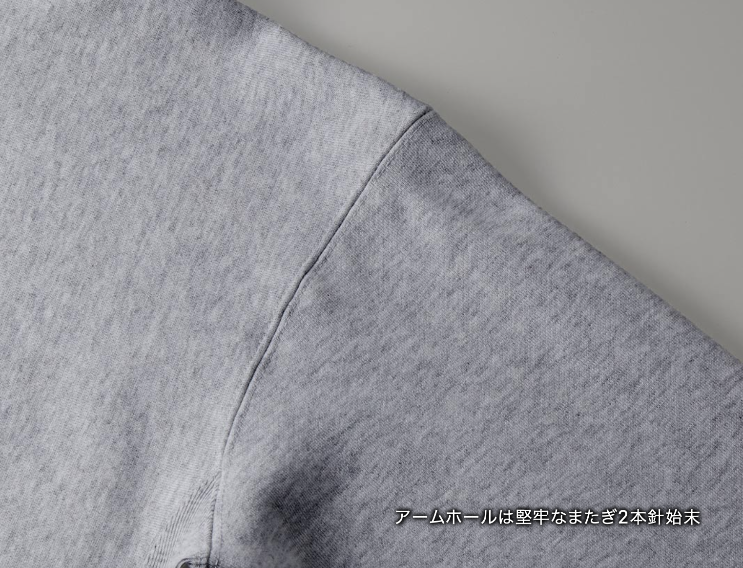 12.0ozのヘビーウェイト生地を採用し、厚みとしっかりとしたハリのあるタフな仕上がりが特徴です。良質な素材を着心地よく仕立て、耐久性にも優れているため型崩れしにくく、アウター・インナーのどちらとしても着用可能。内側には保温性の高い裏起毛を使用し、寒い季節でも快適な着心地をキープする一着です。